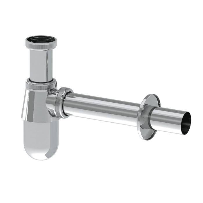 Syfon bez spustu do umywalki wykonany z mosiądzu z nakrętką 1 1” z rurą odpływową średnicy 32mm i długości 300 mm. W komplecie okrągła rozeta o średnicy 70 mm i wysokości 11mm.