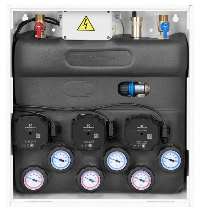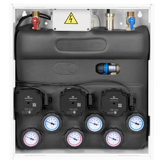 Wyposażony w pompy Grundfos UPm³ i termostatyczny zawór mieszający ATM 561 z regulacją 20 ÷ 43°C. Zakres dobrany na podstawie optymalnych temperatur zasilania instalacji ogrzewania podłogowego.