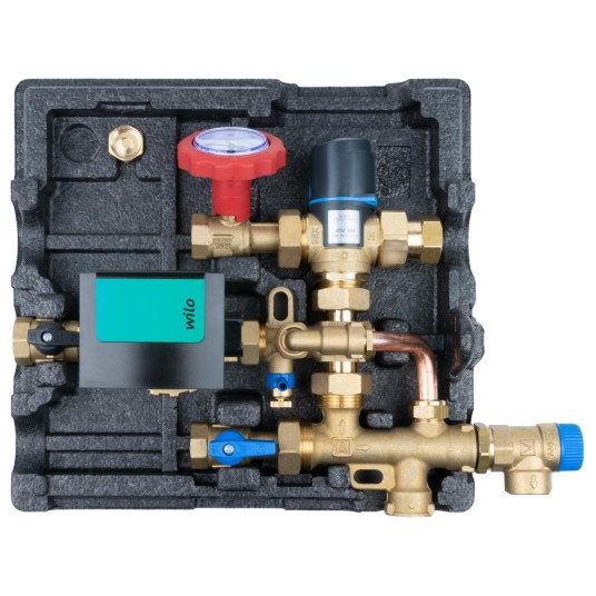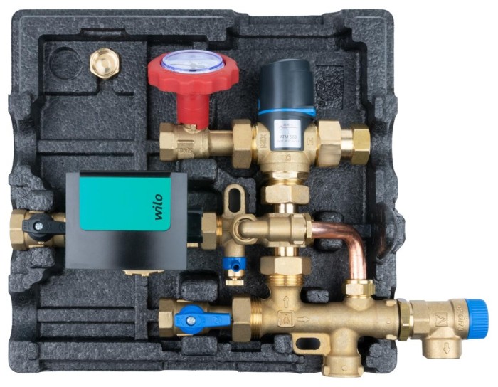 Niezbędna armatura: zawór termostatyczny ATM, termometr z wbudowanym zaworem odcinającym, cztery wbudowane zawory zwrotne, dwa zawory odcinające, zawór upustowo-odpowietrzający, zawór bezpieczeństwa 6 bar.