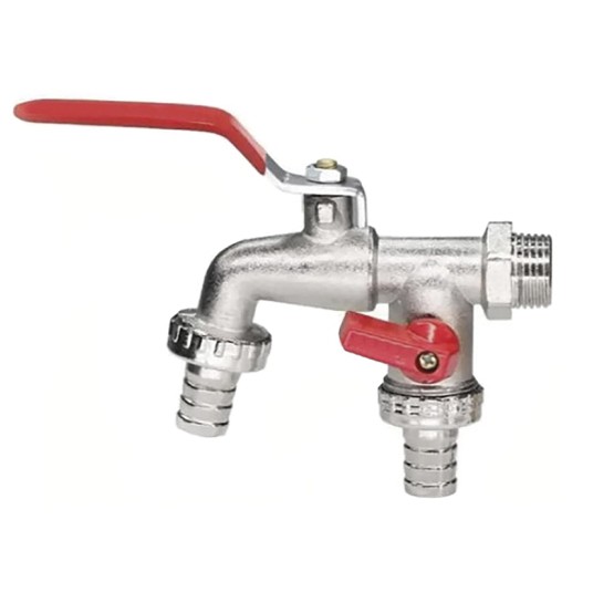 Zawór czerpalny z rączką z dodatkowym przyłączem. Końcówki metalowe na węża
