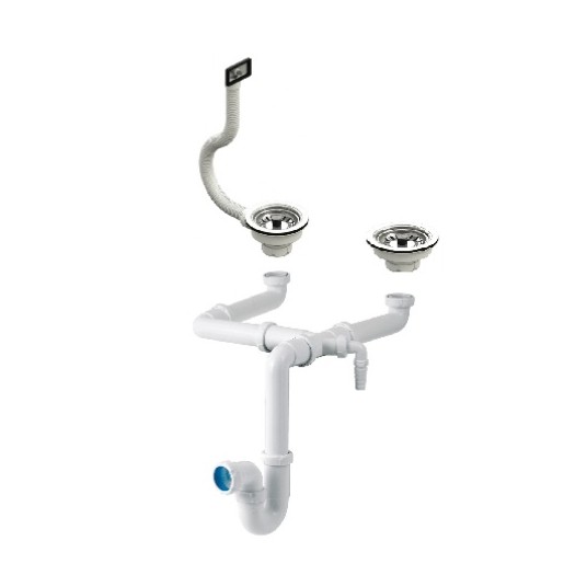 Półsyfon do zlewu rurowy 6/4, dwukomorowy, zasyfonowanie podścienne, do nierównych komór, wlot na zmywarkę + odpływ umywalkowy koszyczkowy, bez przelewu 6/4×115 + odpływ umywalkowy koszyczkowy 6/4”x115 z przelewem