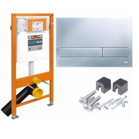 JOMOTech 3W1 samodzielny element WC do muszli naściennej, ze spłuczką podtynkową SLK, spłukiwanie dwudzielne lub funkcja Start/Stop, z obsługą od przodu. Wysokość montażowa 1120 mm. W skład zestawu wchodzą:
