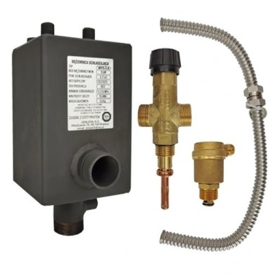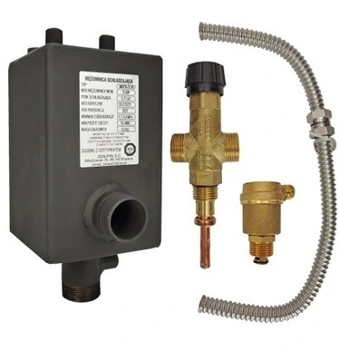 Wężownica schładzająca wraz z zaworem jednofunkcyjnym (schładza całą instalację gdy temperatura przekroczy 97 stopni Celsjusza, nie dopuszcza do przegrzania wody w instalacji).