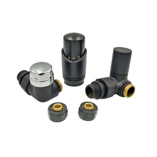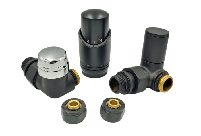 Zestaw ze złączką do rur PEX w kolorze Zawór termostatyczny z głowicą i zawór odcinający z pokrętłem