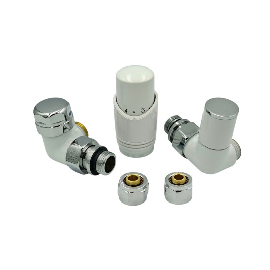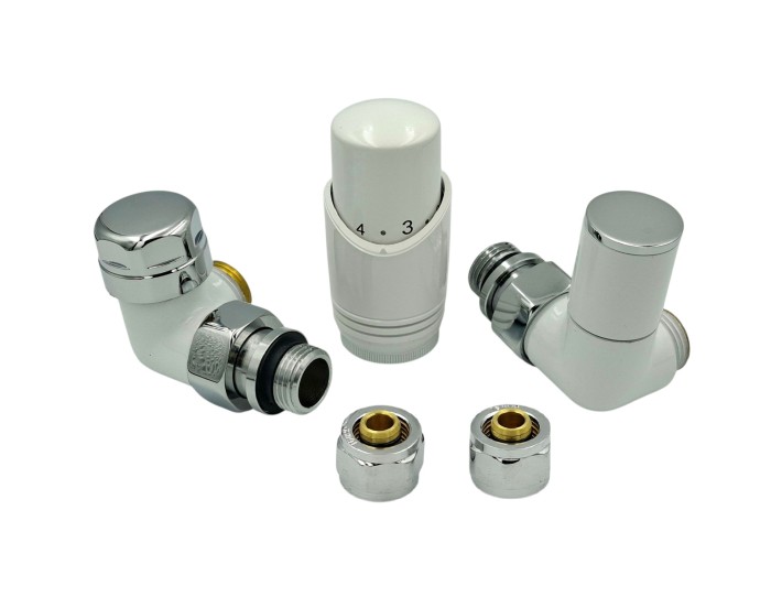 Zestaw ze złączką do rur PEX w kolorze Zawór termostatyczny z głowicą i zawór odcinający z pokrętłem