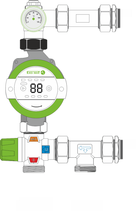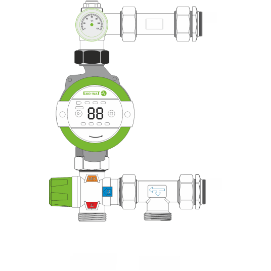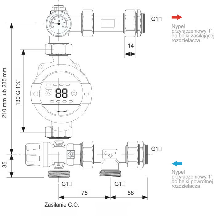 Zestaw pompowy przeznaczny do montażu z rozdzielaczami instalacji podłogowych oraz grzejnikowych z rozstawem 210 mm. Grupa pompowa to zestaw utrzymujący stałą temperaturę dostarczaną do instalacji ogrzewania. Składa się z termostatycznego zaworu mieszającego MIX T 25-20/43, śrubunków przyłączeniowych pomp, termometru, trójnika przyłączeniowego oraz elementów podłączenia rozdzielacza 1 cal. W skład zestawu wchodzi pompa IBO OHI 25-60/130.